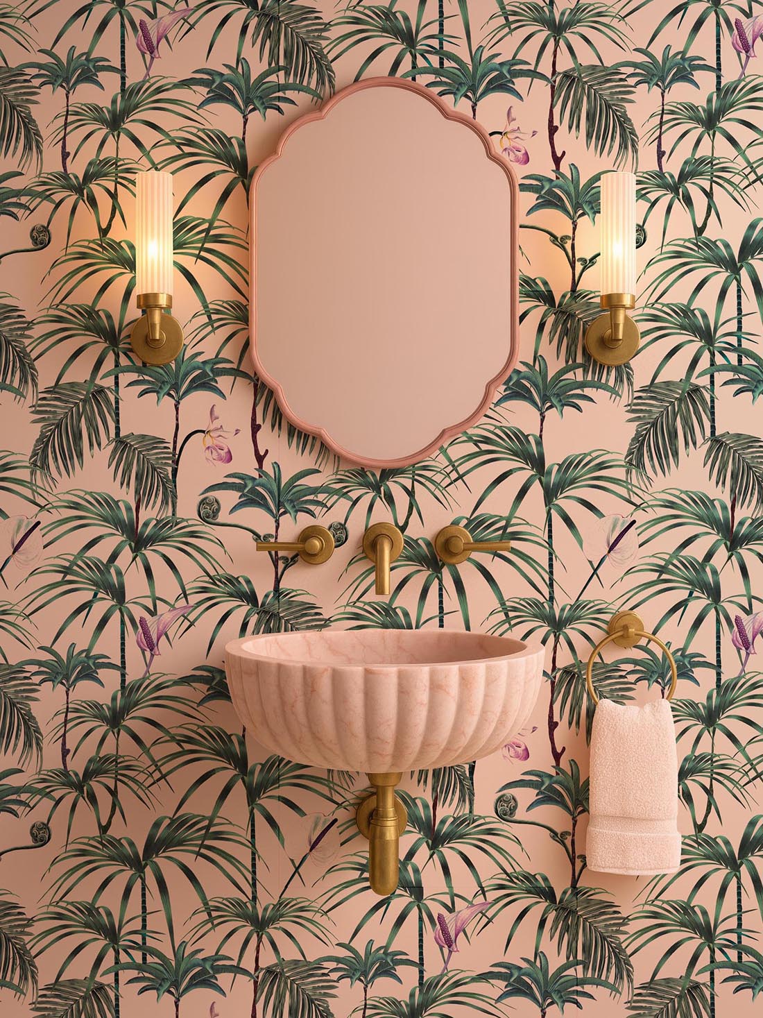 This palm leaf wallpaper combines tropical leaf motifs with green and pink floral accents, creating a vintage botanical wallpaper with a charming pink backdrop.